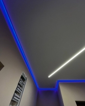 ✔️ По периметру установили парящий тканевый профиль М1 с RGB лентой DUMLIGHT.